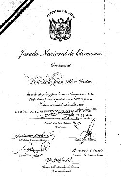 1980-1985 Credencial de Diputado por el departamento de la Libertad 1985-1990 Credencial de Diputado por el departamento de la Libertad 2000-2005 Credencial de Congresista de la República