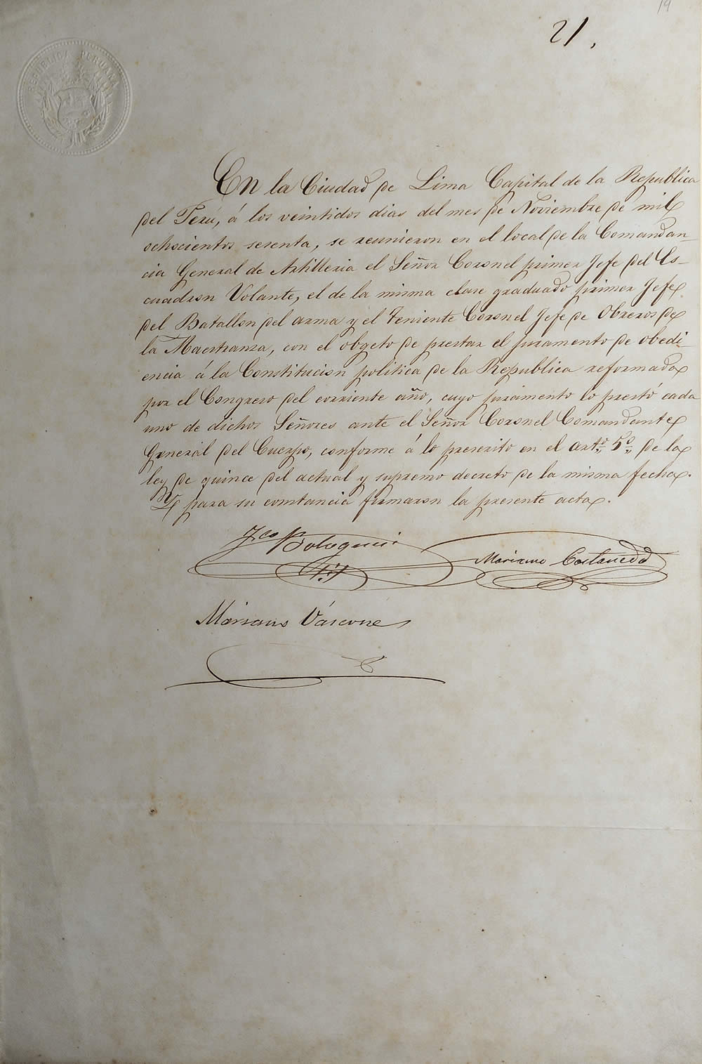 Acta del juramento a la Constitución Política del Perú de 1860 del Héroe de la Nación, Coronel don Francisco Bolognesi.El Congreso de 1860 reforma la Constitución de 1856, siendo promulgada por el Presidente de la República, don Ramón Castilla, el 13 de noviembre de 1860.