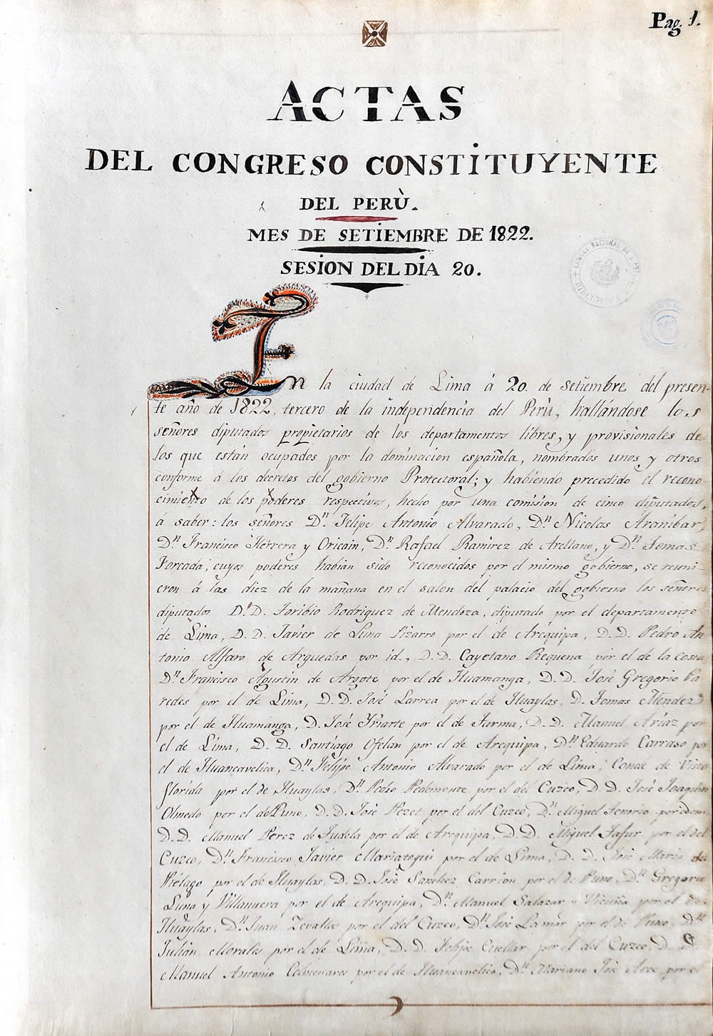 Mediante decreto del 27 de diciembre de 1821, el Protector del Perú, don José de San Martín, convoca a elecciones para la reunión del Congreso General Constituyente del Perú. Su instalación acaece el 20 de setiembre de 1822 y lo sucedido en aquella histórica sesión se encuentra registrado en la primera acta del libro. En ella se puede apreciar el reconocimiento de los representantes a los poderes del Estado, así como la primera fórmula de juramentación de los mismos.