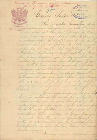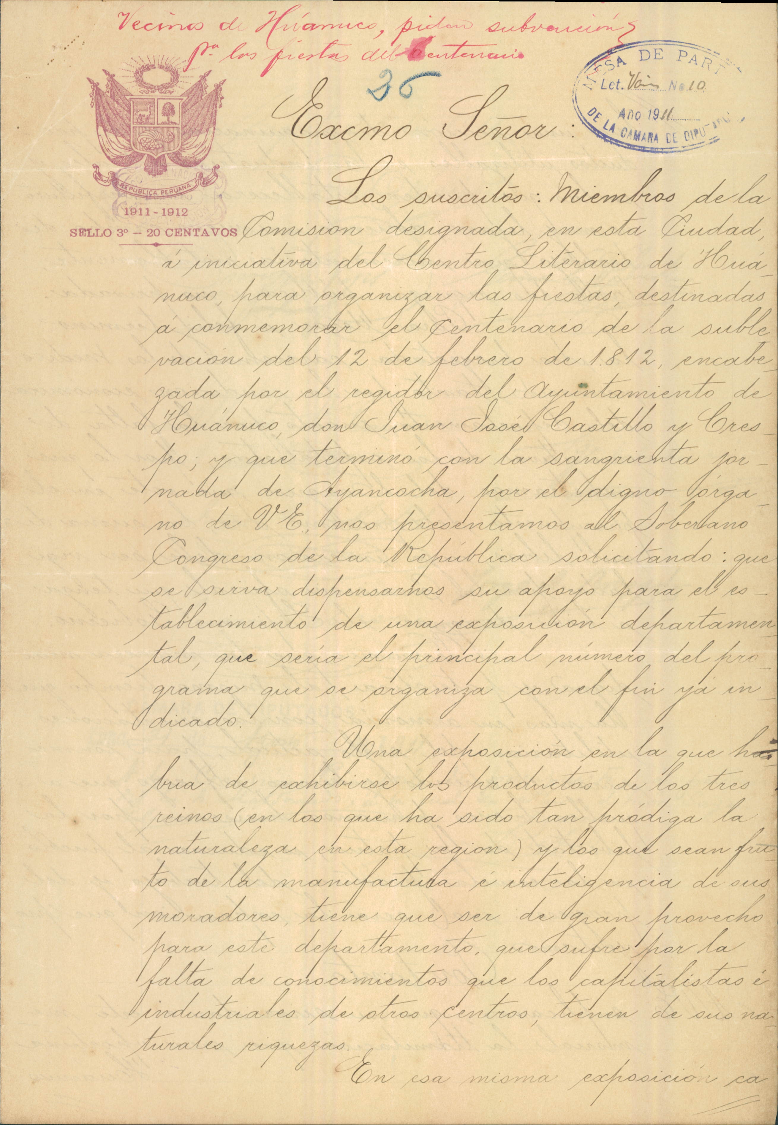 El 25 de octubre de 1911 integrantes del “Centro Literario de Huánuco” comisionados para organizar las fiestas destinadas a la conmemoración del Centenario de la Sublevación encabezada por el Regidor del Ayuntamiento de Huánuco, don Juan José Crespo y Castillo el 12 de febrero de 1812, presentaron un memorial al Congreso de la República, solicitando apoyo para la realización de una exposición de productos naturales y de manufacturas del Departamento de Huánuco.