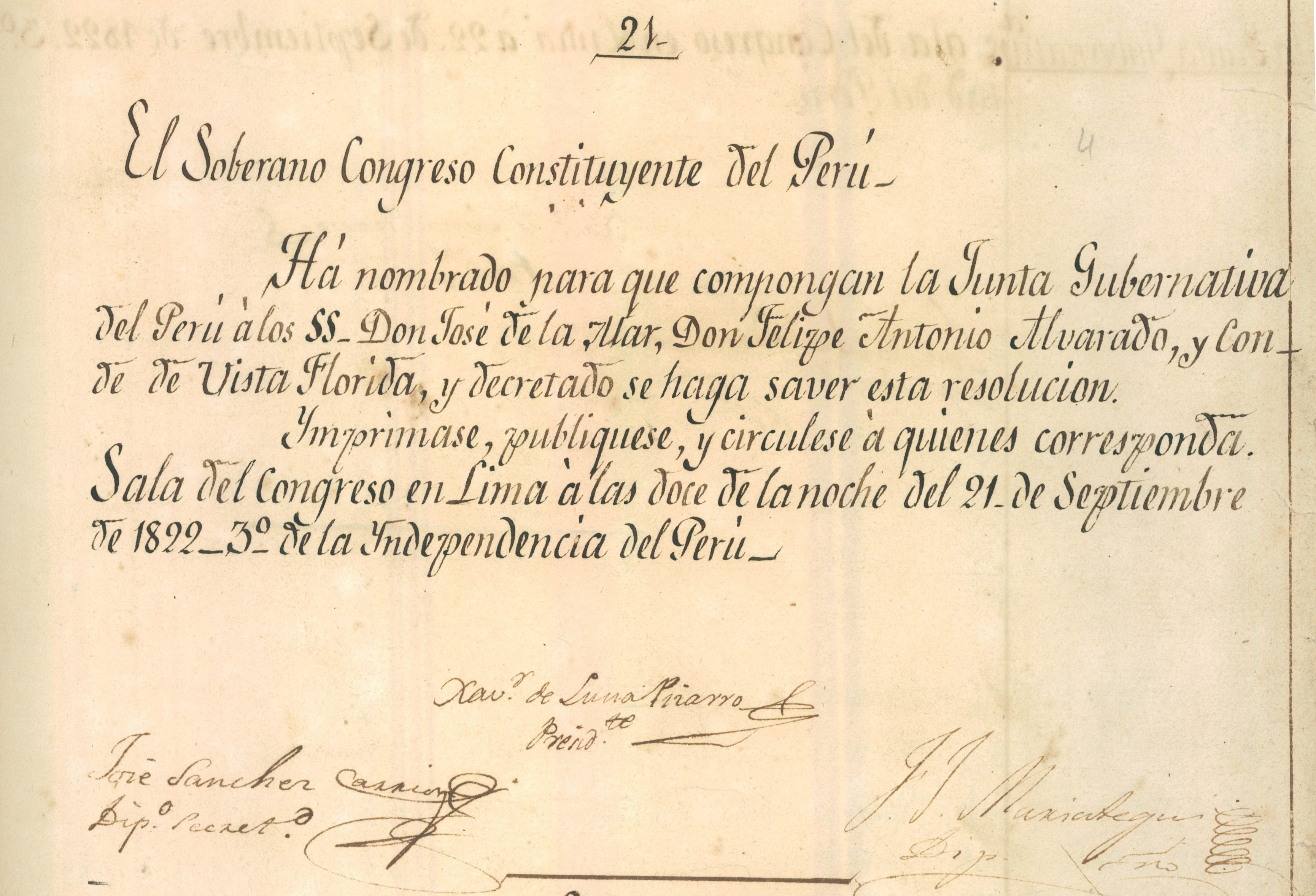 En Sesión Extraordinaria del mismo día 21 de setiembre, convocada a las 9 de la noche se procedió con la elección de los señores congresistas que debían componer la Junta Gubernativa, resultando electos los señores José de La Mar con 53 votos, Felipe Antonio Alvarado con 44 votos y Manuel Salazar y Baquíjano, Conde de Vista Florida con 42 votos, inmediatamente se ordenó su publicación. (Ley del 21 de setiembre de 1822)