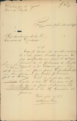En escrito fechado el 5 de julio de 1876, el Sr. José Abelardo Garrido, se excusa, de no participar en las Juntas Preparatorias de la Cámara de Diputados, por encontrarse enfermo e indica que el electo Diputado Suplente Sr. Florentino Barreto, representará a la Provincia de Paita.  El 13 de julio de 1876, don Miguel Grau Seminario, mediante documento dirigido a los Secretarios de la Cámara de Diputados, adjunta el acta de su elección como Diputado Propietario por la Provincia de Paita, para que den cuenta a la Comisión de Poderes.