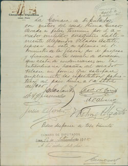 “…La Cámara de Diputados con motivo del raid Lima – Cusco, llevado a feliz término por el aviador militar cusqueño subteniente Alejandro Velasco Astete, expresa un voto de aplauso al señor Ministro de Guerra por el progreso y eficiencia de la escuela de aviación, que acaba de evidenciarse con la extraordinaria hazaña del aviador Velasco, en forma que satisface las expectativas patrióticas del país…”