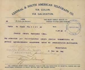 Desde París y mediante telegrama que es leído en la Sesión de la Cámara de Diputados del 17 de setiembre de 1910; Bielovucic, agradece la congratulación expresada por la Cámara.