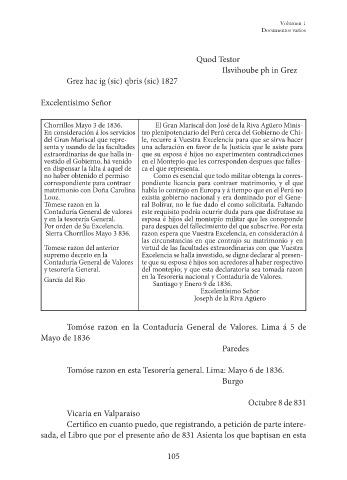Chorrillos Mayo 3 de 1836. El Gran Mariscal don José de la Riva Agüero Minis-
