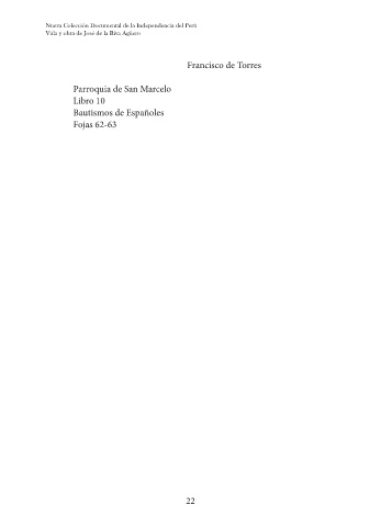 Nueva Colección Documental de la Independencia del Perú Vida y obra de José de la Riva Agüero Francisco de Torres Parroquia de San Marcelo Libro 10 Bautismos de Españoles Fojas 62-63 22