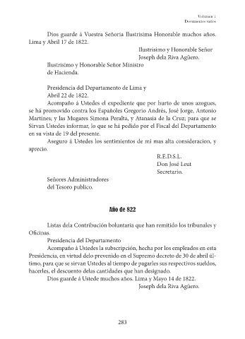 Dios guarde á Ustede muchos años. Lima y Mayo 14 de 1822.