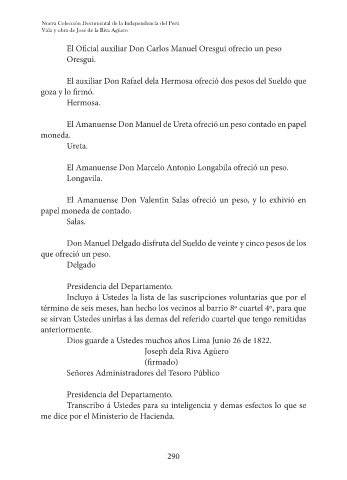 El Amanuense Don Manuel de Ureta ofreció un peso contado en papel