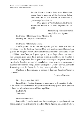 Tesoreria general del Estado del Perú en Lima Septiembre 9 de 1822.
