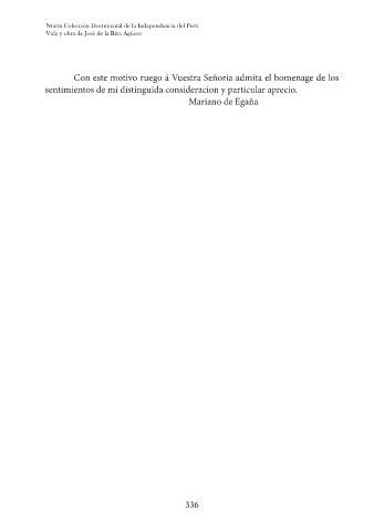 Nueva Colección Documental de la Independencia del Perú Vida y obra de José de la Riva Agüero Con este motivo ruego á Vuestra Señoria admita el homenage de los sentimientos de mi distinguida consideracion y particular aprecio. Mariano de Egaña 336