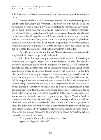 Vuestra Excelencia y la del Senado, ó la gratitud debida por su instalacion, y el