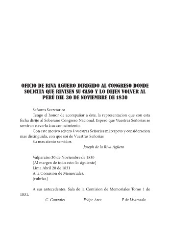 OFICIO DE RIVA AGÜERO DIRIGIDO AL CONGRESO DONDE