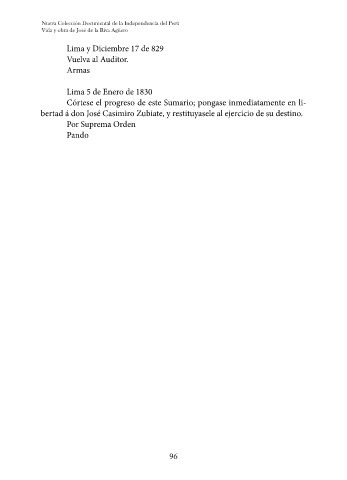 bertad á don José Casimiro Zubiate, y restituyasele al ejercicio de su destino.