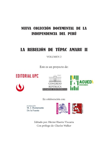 NUEVA COLECCIÓN DOCUMENTAL DE LA INDEPENDENCIA DEL PERÚ LA REBELIÓN DE TÚPAC AMARU II VOLUMEN 2 Este es un proyecto de: En colaboración con: Editado por: Héctor Huerto Vizcarra Con prólogo de: Charles Walker