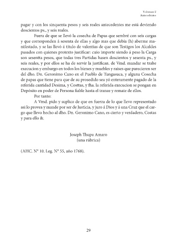del dho. Dn. Geronimo Cano en el Pueblo de Tungasuca, y alguna Cosecha