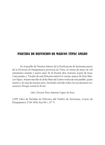 PARTIDA DE DEFUNCIÓN DE MARCOS TÚPAC AMARU