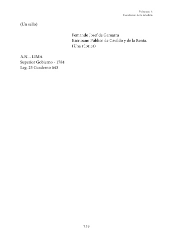 Volumen 4 Conclusión de la rebelión (Un sello) Femando Josef de Gamarra Escribano Público de Cavildo y de la Renta. (Una rúbrica) A.N. - LIMA Superior Gobierno - 1784 Leg. 23 Cuaderno 643 759