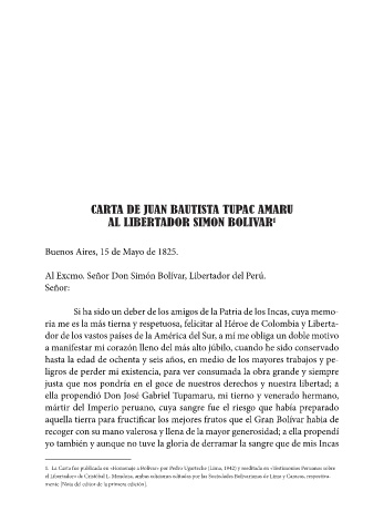 1. La Carta fue publicada en «Homenaje a Bolívar» por Pedro Ugarteche (Lima, 1942) y reeditada en «Testimonios Peruanos sobre