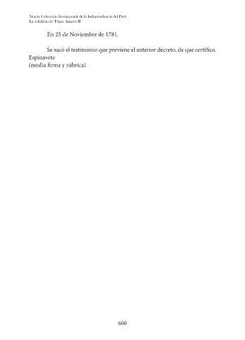 Nueva Colección Documental de la Independencia del Perú La rebelión de Túpac Amaru II En 25 de Noviembre de 1781. Se sacó el testimonio que previene el anterior decreto, de que certifico. Espinavete (media firma y rúbrica) 600