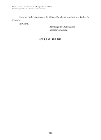 Huarás 29 de Noviembre de 1820 – Excelentisimo Señor = Pedro de