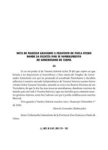 NOTA DE MARCELO GRANADOS A FRANCISCO DE PAULA OTERO