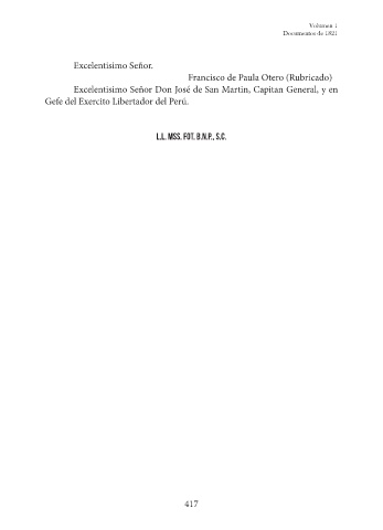 Excelentisimo Señor Don José de San Martin, Capitan General, y en