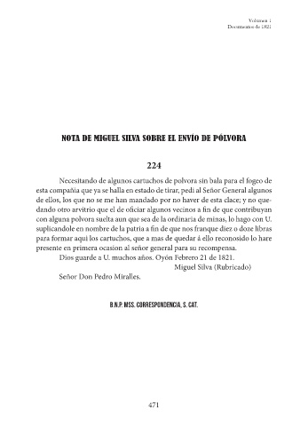 NOTA DE MIGUEL SILVA SOBRE EL ENVÍO DE PÓLVORA