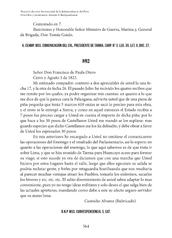 A. CEHMP. Mss. Comunicación del Crl. Presidente de Tarma. Carp. N° 3. Leg. 30, Let. O, Doc. 27.