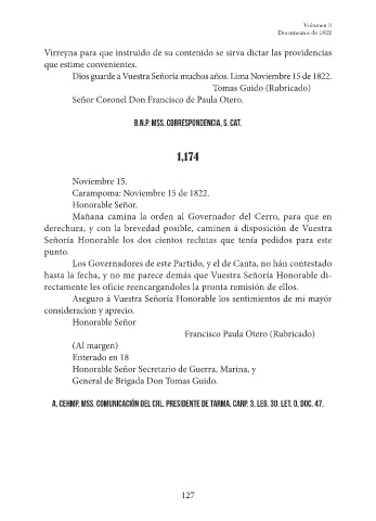 Dios guarde a Vuestra Señoría muchos años. Lima Noviembre 15 de 1822.