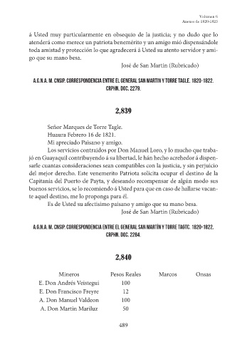 A.G.N.A. m. CNSIP. Correspondencia entre el General San Martín y Torre Tagtc. 1820-1822.