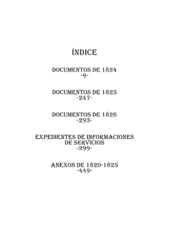 Índice dOcUMenTOS de 1824 -9- dOcUMenTOS de 1825 -247- dOcUMenTOS de 1826 -293- expedienTeS de infOrMaciOneS de ServiciOS -299- anexOS de 1820-1825 -449-