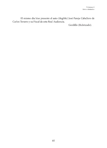 Volumen 2 Autos criminales El mismo dia hise presente el auto (ilegible) José Pareja Caballero de Carlos Tersero y su Fiscal de esta Real Audiencia. Gordillo (Rubricado). 85