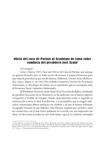 1. Oficio del Cura de Pachas al Arzobispo de Lima, Doctor Bartolomé de Las Heras, sobre la conducta del Presbítero José Ayala,