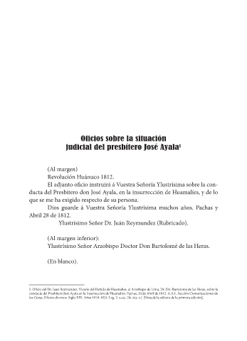 1. Oficio del Dr. Juan Reymúndez, Vicario del Partido de Huamalíes, al Arzobispo de Lima, Dr. Dn. Bartolomé de las Heras, sobre la