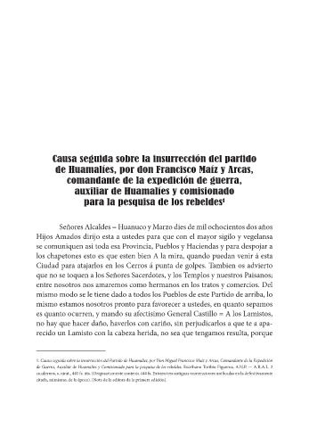 1. Causa seguida sobre la insurrección del Partido de Huamalíes, por Don Miguel Francisco Maíz y Arcas, Comandante de la Expedición