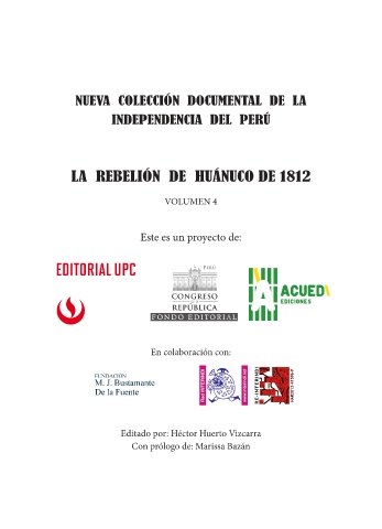 NUEVA COLECCIÓN DOCUMENTAL DE LA INDEPENDENCIA DEL PERÚ LA REBELIÓN DE HUÁNUCO DE 1812 VOLUMEN 4 Este es un proyecto de: En colaboración con: Editado por: Héctor Huerto Vizcarra Con prólogo de: Marissa Bazán