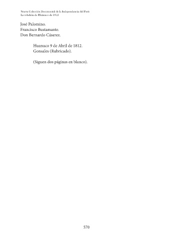 Nueva Colección Documental de la Independencia del Perú La rebelión de Huánuco de 1812 José Palomino. Francisco Bustamante. Don Bernardo Cáserez. Huanuco 9 de Abril de 1812. Gonsales (Rubricado). (Siguen dos páginas en blanco). 570