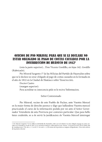1. Pio Miraval, Sargento 1° de las Milicias del Partido de Huamalíes, sobre que se le declare no estar obligado al pago de costas cau-