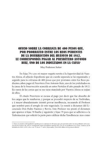 rrección de Huánuco de 1812, le correspondia pagar al Presbítero Antonio Ruiz, uno de los indultados en la Causa. Huánuco 28 de