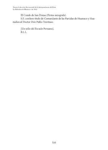 S.E. confiere titulo de Comandante de las Partidas de Huanuco y Hua-