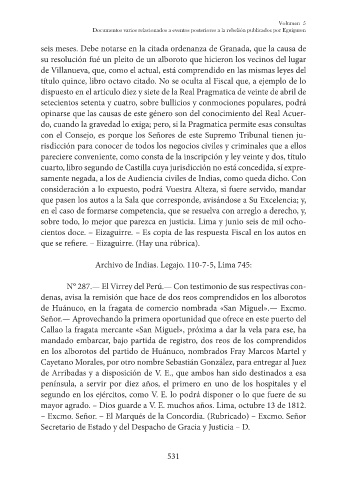N° 287.— El Virrey del Perú.— Con testimonio de sus respectivas con-