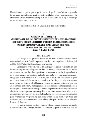 «MANIFIESTO QUE JUAN JOSE CASTELLI REPRESENTANTE DE LA JUNTA PROVISIONAL