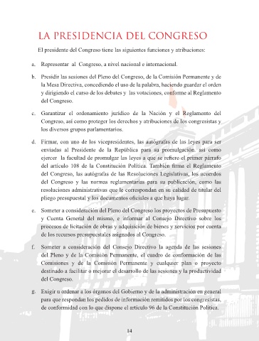 El presidente del Congreso tiene las siguientes funciones y atribuciones: