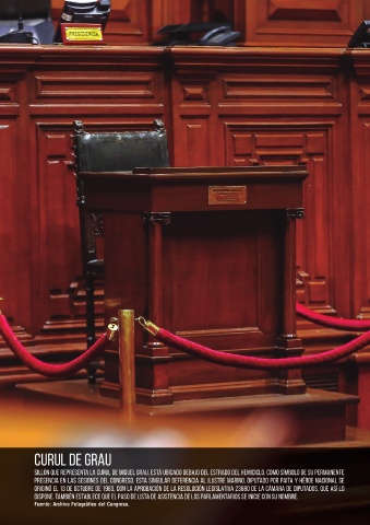 Sillón que representa la curul de Miguel Grau, está ubicado debajo del estrado del hemiciclo, como símbolo de su permanente ACTIVIDAD PARLAMENTARIA.