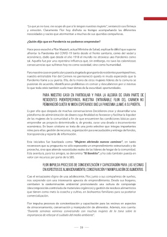 de colaboración, organizar encuentros y conversatorios con algún tema particular Flor impulsa procesos de concientización y capacitación para las vecinas en aspectos