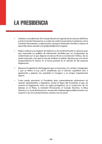 108 de la Constitución Política. También rman el Reglamento del Congreso, las debates en el Pleno, la Comisión Permanente, el Consejo Directivo, la Mesa
