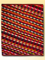 Diseños: guarda de quengos en cuatro lados; bandas de estrellas, rombos y llamas; color guinda de fondo y diseños en amarillo ocre y azul pálido.