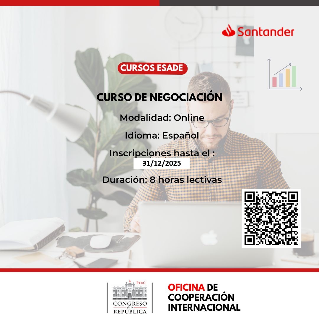 CURSO: NEGOCIACIÓN SANTANDER OPEN ACADEMY brinda a través de su plataforma web la apertura del CURSO DE NEGOCIOS, el cual ofrece la posibilidad de aprender de forma online las herramientas estratégicas para la negociación. Fuente cooperante: Banco Santander Modalidad: Online Idioma: Español Inscripciones: hasta el 31/12/2025 Duración: 8 horas lectivas |