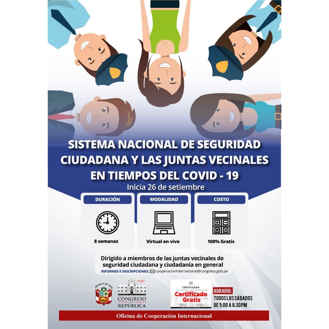 CURSO: Sistema Nacional de Seguridad Ciudadana y las Juntas Vecinales en tiempos del Covid-19 (Perú) La Oficina de Cooperación Internacional tiene el encargo de realizar la difusión de cursos de capacitación en temas específicos que nuestros Cooperantes y otras entidades ofrecen, buscando fortalecer las capacidades de nuestros servidores y público en general. Para inscribirse puede hacer clic aquí. Los certificados se emitirán automáticamente con el nombre que registre al momento de su inscripción. |