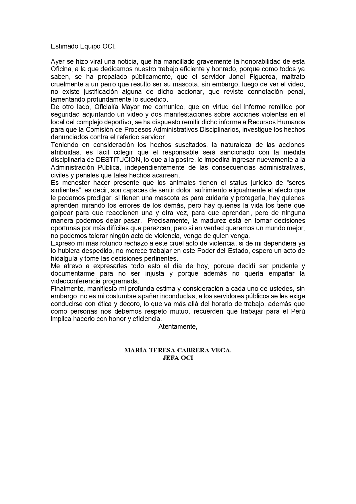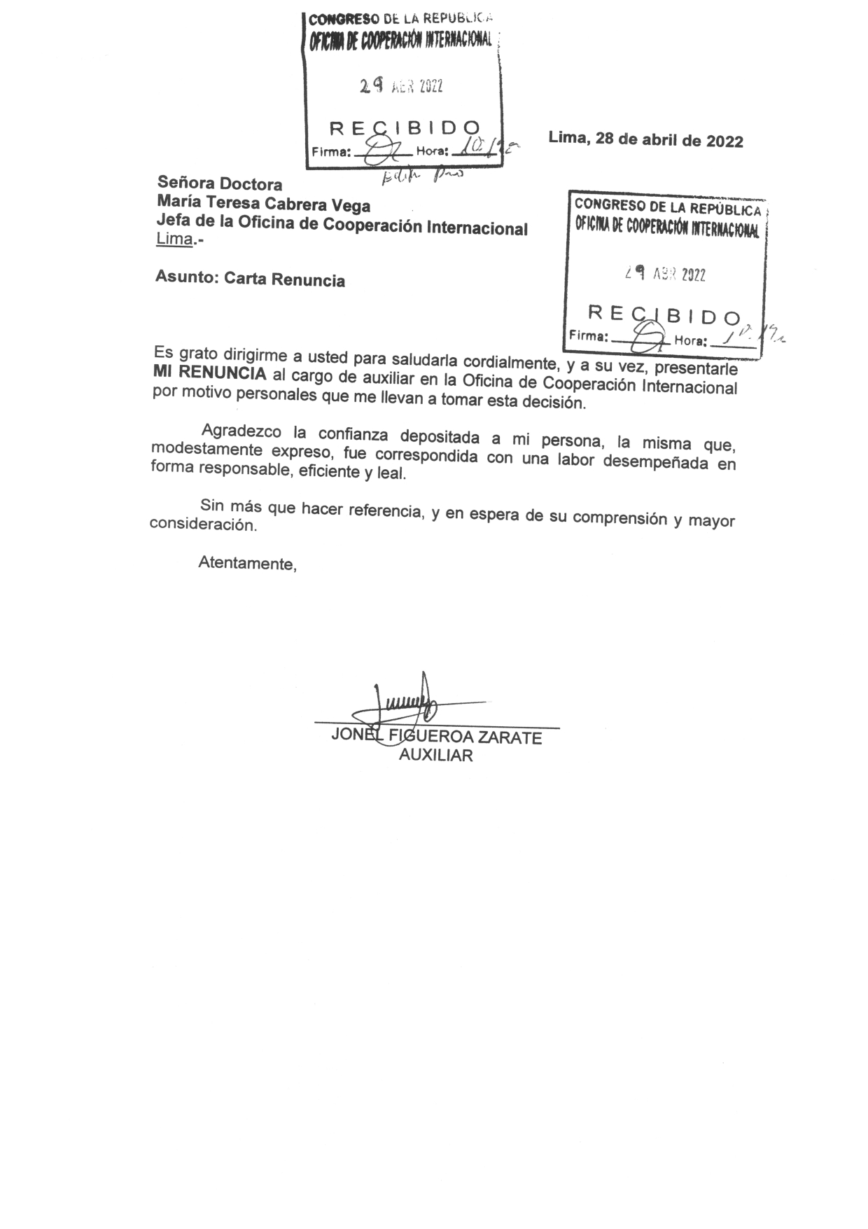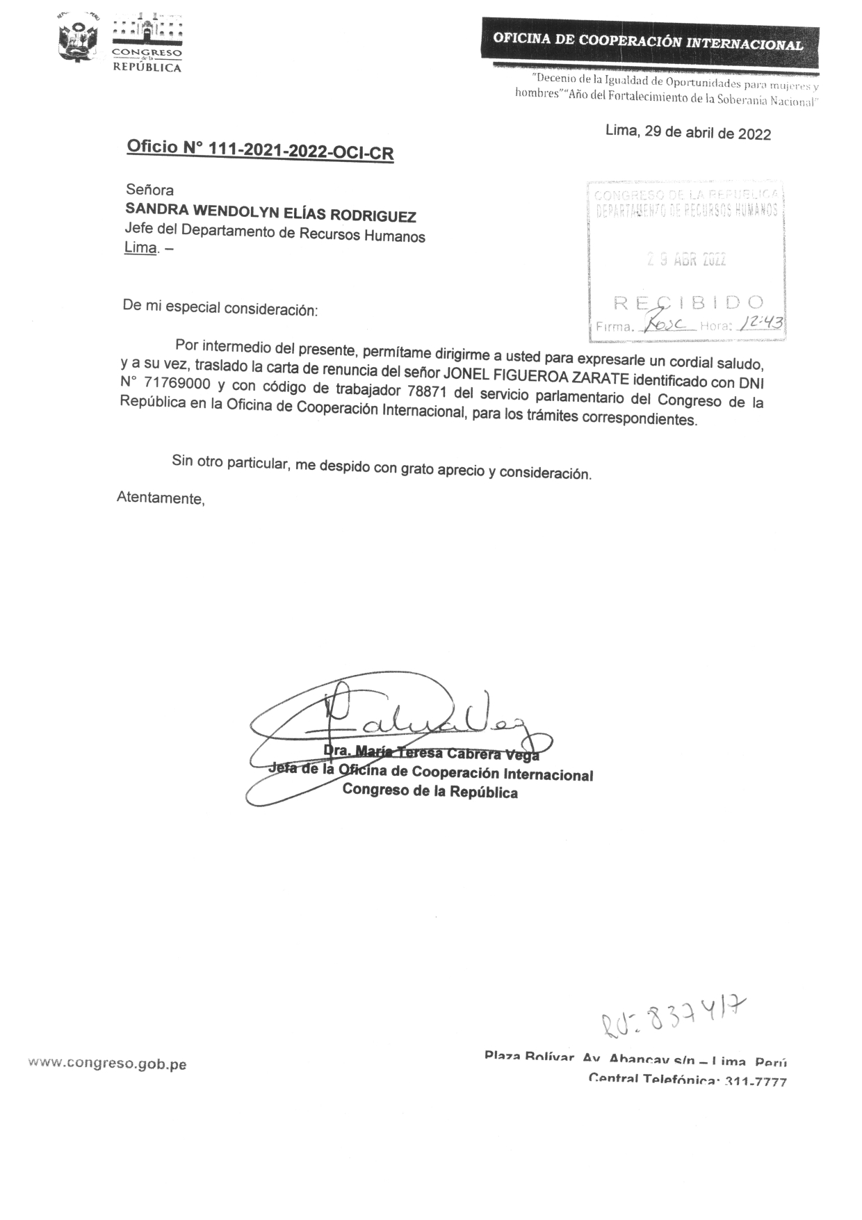 La Oficina de Cooperación Internacional del Congreso de la República del Perú, informa que el trabajador ya no labora en esta oficina, ni en ninguna dependencia de este poder del estado